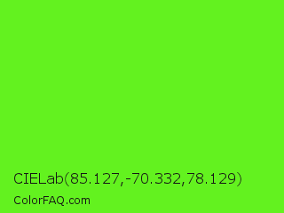 CIELab 85.127,-70.332,78.129 Color is a normal green color and the nearest color is Bright Green #66ff00. Hex code #63f21f and RGB value is rgb(99,242,31). In RGB color space, this color is composed of 39% red, 95% green, 12% blue, In CMYK color space, this color is composed of 59% cyan, 0% magenta, 87% yellow , 5% black , In HSL color space, this color has a hue angle of 101° , 89% saturation and 54% lightness.