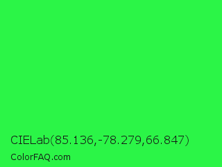 CIELab 85.136,-78.279,66.847 Color is a normal green color and the nearest color is Malachite #0bda51. Hex code #2bf547 and RGB value is rgb(43,245,71). In RGB color space, this color is composed of 17% red, 96% green, 28% blue, In CMYK color space, this color is composed of 82% cyan, 0% magenta, 71% yellow , 4% black , In HSL color space, this color has a hue angle of 128° , 91% saturation and 56% lightness.