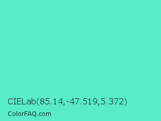 CIELab 85.14,-47.519,5.372 Color is a light cyan color and the nearest color is Turquoise #40e0d0. Hex code #58ecc9 and RGB value is rgb(88,236,201). In RGB color space, this color is composed of 35% red, 93% green, 79% blue, In CMYK color space, this color is composed of 63% cyan, 0% magenta, 15% yellow , 7% black , In HSL color space, this color has a hue angle of 166° , 80% saturation and 64% lightness.