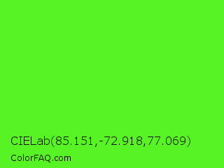 CIELab 85.151,-72.918,77.069 Color is a normal green color and the nearest color is Neon Green #39ff14. Hex code #58f324 and RGB value is rgb(88,243,36). In RGB color space, this color is composed of 35% red, 95% green, 14% blue, In CMYK color space, this color is composed of 64% cyan, 0% magenta, 85% yellow , 5% black , In HSL color space, this color has a hue angle of 105° , 90% saturation and 55% lightness.