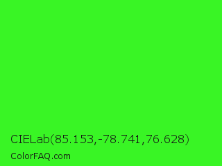 CIELab 85.153,-78.741,76.628 Color is a normal green color and the nearest color is Neon Green #39ff14. Hex code #39f525 and RGB value is rgb(57,245,37). In RGB color space, this color is composed of 22% red, 96% green, 15% blue, In CMYK color space, this color is composed of 77% cyan, 0% magenta, 85% yellow , 4% black , In HSL color space, this color has a hue angle of 114° , 91% saturation and 55% lightness.
