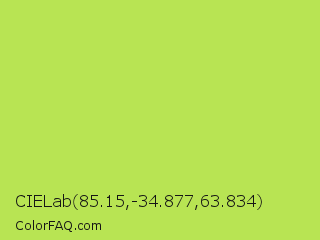 CIELab 85.15,-34.877,63.834 Color is a light lime color and the nearest color is June Bud #bdda57. Hex code #b8e453 and RGB value is rgb(184,228,83). In RGB color space, this color is composed of 72% red, 89% green, 33% blue, In CMYK color space, this color is composed of 19% cyan, 0% magenta, 64% yellow , 11% black , In HSL color space, this color has a hue angle of 78° , 73% saturation and 61% lightness.