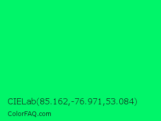 CIELab 85.162,-76.971,53.084 Color is a normal green color and the nearest color is Spring Green #00ff7f. Hex code #00f569 and RGB value is rgb(0,245,105). In RGB color space, this color is composed of 0% red, 96% green, 41% blue, In CMYK color space, this color is composed of 100% cyan, 0% magenta, 57% yellow , 4% black , In HSL color space, this color has a hue angle of 146° , 100% saturation and 48% lightness.