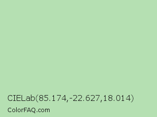 CIELab 85.174,-22.627,18.014 Color is a light green color and the nearest color is Moss Green #addfad. Hex code #b5e0b2 and RGB value is rgb(181,224,178). In RGB color space, this color is composed of 71% red, 88% green, 70% blue, In CMYK color space, this color is composed of 19% cyan, 0% magenta, 21% yellow , 12% black , In HSL color space, this color has a hue angle of 116° , 43% saturation and 79% lightness.