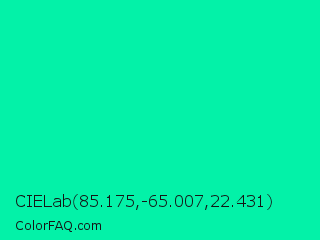 CIELab 85.175,-65.007,22.431 Color is a normal green color and the nearest color is Medium Spring Green #00fa9a. Hex code #03f2a8 and RGB value is rgb(3,242,168). In RGB color space, this color is composed of 1% red, 95% green, 66% blue, In CMYK color space, this color is composed of 99% cyan, 0% magenta, 31% yellow , 5% black , In HSL color space, this color has a hue angle of 161° , 98% saturation and 48% lightness.