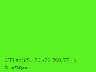 CIELab 85.176,-72.709,77.1 Color is a normal green color and the nearest color is Neon Green #39ff14. Hex code #59f324 and RGB value is rgb(89,243,36). In RGB color space, this color is composed of 35% red, 95% green, 14% blue, In CMYK color space, this color is composed of 63% cyan, 0% magenta, 85% yellow , 5% black , In HSL color space, this color has a hue angle of 105° , 90% saturation and 55% lightness.