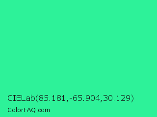 CIELab 85.181,-65.904,30.129 Color is a normal green color and the nearest color is Shamrock #33cc99. Hex code #2df299 and RGB value is rgb(45,242,153). In RGB color space, this color is composed of 18% red, 95% green, 60% blue, In CMYK color space, this color is composed of 81% cyan, 0% magenta, 37% yellow , 5% black , In HSL color space, this color has a hue angle of 153° , 88% saturation and 56% lightness.
