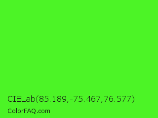CIELab 85.189,-75.467,76.577 Color is a normal green color and the nearest color is Neon Green #39ff14. Hex code #4cf426 and RGB value is rgb(76,244,38). In RGB color space, this color is composed of 30% red, 96% green, 15% blue, In CMYK color space, this color is composed of 69% cyan, 0% magenta, 84% yellow , 4% black , In HSL color space, this color has a hue angle of 109° , 90% saturation and 55% lightness.