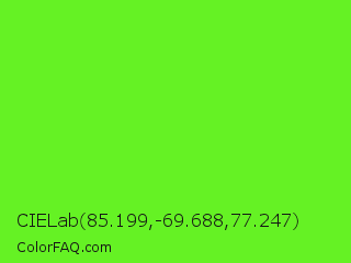CIELab 85.199,-69.688,77.247 Color is a normal green color and the nearest color is Spring Frost #87ff2a. Hex code #65f224 and RGB value is rgb(101,242,36). In RGB color space, this color is composed of 40% red, 95% green, 14% blue, In CMYK color space, this color is composed of 58% cyan, 0% magenta, 85% yellow , 5% black , In HSL color space, this color has a hue angle of 101° , 89% saturation and 55% lightness.