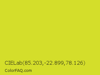 CIELab 85.203,-22.899,78.126 Color is a normal yellow color and the nearest color is Pear #d1e231. Hex code #d4de2a and RGB value is rgb(212,222,42). In RGB color space, this color is composed of 83% red, 87% green, 16% blue, In CMYK color space, this color is composed of 5% cyan, 0% magenta, 81% yellow , 13% black , In HSL color space, this color has a hue angle of 63° , 73% saturation and 52% lightness.