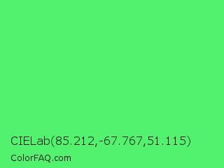 CIELab 85.212,-67.767,51.115 Color is a light green color and the nearest color is Screamin Green #66ff66. Hex code #52f26e and RGB value is rgb(82,242,110). In RGB color space, this color is composed of 32% red, 95% green, 43% blue, In CMYK color space, this color is composed of 66% cyan, 0% magenta, 55% yellow , 5% black , In HSL color space, this color has a hue angle of 131° , 86% saturation and 64% lightness.