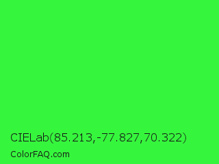 CIELab 85.213,-77.827,70.322 Color is a normal green color and the nearest color is Lime Green #32cd32. Hex code #36f53d and RGB value is rgb(54,245,61). In RGB color space, this color is composed of 21% red, 96% green, 24% blue, In CMYK color space, this color is composed of 78% cyan, 0% magenta, 75% yellow , 4% black , In HSL color space, this color has a hue angle of 122° , 91% saturation and 59% lightness.