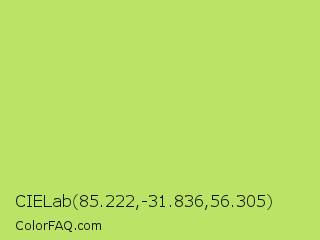 CIELab 85.222,-31.836,56.305 Color is a light lime color and the nearest color is Inchworm #b2ec5d. Hex code #bbe365 and RGB value is rgb(187,227,101). In RGB color space, this color is composed of 73% red, 89% green, 40% blue, In CMYK color space, this color is composed of 18% cyan, 0% magenta, 56% yellow , 11% black , In HSL color space, this color has a hue angle of 79° , 69% saturation and 64% lightness.