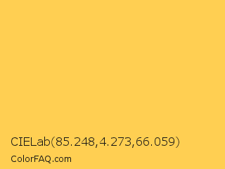 CIELab 85.248,4.273,66.059 Color is a light orange color and the nearest color is Golden Tainoi #ffcc5c. Hex code #ffcf52 and RGB value is rgb(255,207,82). In RGB color space, this color is composed of 100% red, 81% green, 32% blue, In CMYK color space, this color is composed of 0% cyan, 19% magenta, 68% yellow , 0% black , In HSL color space, this color has a hue angle of 43° , 100% saturation and 66% lightness.