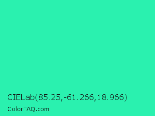 CIELab 85.25,-61.266,18.966 Color is a normal green color and the nearest color is Eucalyptus #44d7a8. Hex code #2af1af and RGB value is rgb(42,241,175). In RGB color space, this color is composed of 16% red, 95% green, 69% blue, In CMYK color space, this color is composed of 83% cyan, 0% magenta, 27% yellow , 5% black , In HSL color space, this color has a hue angle of 160° , 88% saturation and 55% lightness.