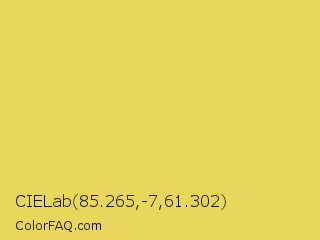 CIELab 85.265,-7,61.302 Color is a light yellow color and the nearest color is Confetti #e9d75a. Hex code #ebd65c and RGB value is rgb(235,214,92). In RGB color space, this color is composed of 92% red, 84% green, 36% blue, In CMYK color space, this color is composed of 0% cyan, 9% magenta, 61% yellow , 8% black , In HSL color space, this color has a hue angle of 51° , 78% saturation and 64% lightness.