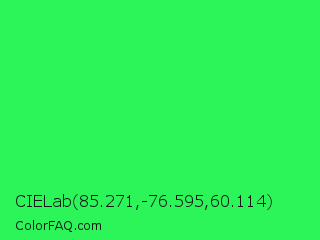 CIELab 85.271,-76.595,60.114 Color is a normal green color and the nearest color is Malachite #0bda51. Hex code #2bf559 and RGB value is rgb(43,245,89). In RGB color space, this color is composed of 17% red, 96% green, 35% blue, In CMYK color space, this color is composed of 82% cyan, 0% magenta, 64% yellow , 4% black , In HSL color space, this color has a hue angle of 134° , 91% saturation and 56% lightness.