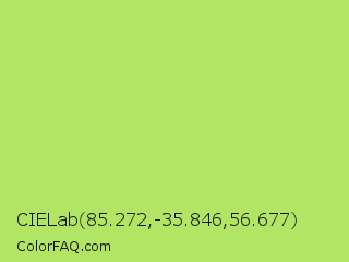 CIELab 85.272,-35.846,56.677 Color is a light green color and the nearest color is Inchworm #b2ec5d. Hex code #b3e564 and RGB value is rgb(179,229,100). In RGB color space, this color is composed of 70% red, 90% green, 39% blue, In CMYK color space, this color is composed of 22% cyan, 0% magenta, 56% yellow , 10% black , In HSL color space, this color has a hue angle of 83° , 71% saturation and 65% lightness.