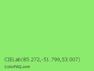 CIELab 85.272,-51.799,53.007 Color is a light green color and the nearest color is Pastel Green #77dd77. Hex code #8bec6b and RGB value is rgb(139,236,107). In RGB color space, this color is composed of 55% red, 93% green, 42% blue, In CMYK color space, this color is composed of 41% cyan, 0% magenta, 55% yellow , 7% black , In HSL color space, this color has a hue angle of 105° , 77% saturation and 67% lightness.