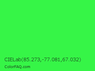 CIELab 85.273,-77.081,67.032 Color is a normal green color and the nearest color is Lime Green #32cd32. Hex code #36f547 and RGB value is rgb(54,245,71). In RGB color space, this color is composed of 21% red, 96% green, 28% blue, In CMYK color space, this color is composed of 78% cyan, 0% magenta, 71% yellow , 4% black , In HSL color space, this color has a hue angle of 125° , 91% saturation and 59% lightness.