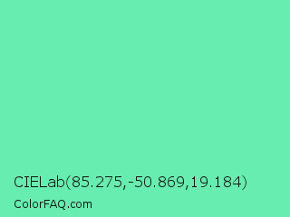 CIELab 85.275,-50.869,19.184 Color is a light green color and the nearest color is Medium Aquamarine #66ddaa. Hex code #67edaf and RGB value is rgb(103,237,175). In RGB color space, this color is composed of 40% red, 93% green, 69% blue, In CMYK color space, this color is composed of 57% cyan, 0% magenta, 26% yellow , 7% black , In HSL color space, this color has a hue angle of 152° , 79% saturation and 67% lightness.