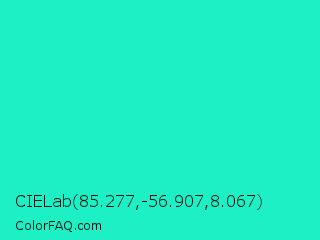 CIELab 85.277,-56.907,8.067 Color is a normal cyan color and the nearest color is Bright Turquoise #08e8de. Hex code #1cf0c4 and RGB value is rgb(28,240,196). In RGB color space, this color is composed of 11% red, 94% green, 77% blue, In CMYK color space, this color is composed of 88% cyan, 0% magenta, 18% yellow , 6% black , In HSL color space, this color has a hue angle of 168° , 88% saturation and 53% lightness.