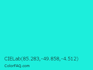 CIELab 85.283,-49.858,-4.512 Color is a normal cyan color and the nearest color is Bright Turquoise #08e8de. Hex code #1ceedc and RGB value is rgb(28,238,220). In RGB color space, this color is composed of 11% red, 93% green, 86% blue, In CMYK color space, this color is composed of 88% cyan, 0% magenta, 8% yellow , 7% black , In HSL color space, this color has a hue angle of 175° , 86% saturation and 52% lightness.