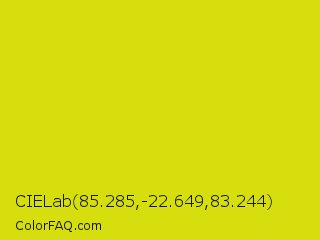 CIELab 85.285,-22.649,83.244 Color is a normal yellow color and the nearest color is Bitter Lemon #cae00d. Hex code #d6de0d and RGB value is rgb(214,222,13). In RGB color space, this color is composed of 84% red, 87% green, 5% blue, In CMYK color space, this color is composed of 4% cyan, 0% magenta, 94% yellow , 13% black , In HSL color space, this color has a hue angle of 62° , 89% saturation and 46% lightness.