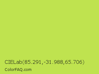 CIELab 85.291,-31.988,65.706 Color is a normal lime color and the nearest color is June Bud #bdda57. Hex code #bfe34f and RGB value is rgb(191,227,79). In RGB color space, this color is composed of 75% red, 89% green, 31% blue, In CMYK color space, this color is composed of 16% cyan, 0% magenta, 65% yellow , 11% black , In HSL color space, this color has a hue angle of 75° , 73% saturation and 60% lightness.