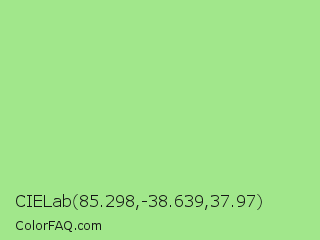CIELab 85.298,-38.639,37.97 Color is a light green color and the nearest color is Feijoa #9fdd8c. Hex code #a1e78b and RGB value is rgb(161,231,139). In RGB color space, this color is composed of 63% red, 91% green, 55% blue, In CMYK color space, this color is composed of 30% cyan, 0% magenta, 40% yellow , 9% black , In HSL color space, this color has a hue angle of 106° , 66% saturation and 73% lightness.