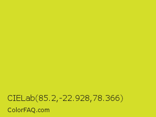 CIELab 85.2,-22.928,78.366 Color is a normal yellow color and the nearest color is Pear #d1e231. Hex code #d4de29 and RGB value is rgb(212,222,41). In RGB color space, this color is composed of 83% red, 87% green, 16% blue, In CMYK color space, this color is composed of 5% cyan, 0% magenta, 82% yellow , 13% black , In HSL color space, this color has a hue angle of 63° , 73% saturation and 52% lightness.