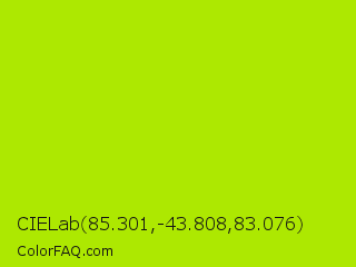 CIELab 85.301,-43.808,83.076 Color is a normal lime color and the nearest color is Inch Worm #b0e313. Hex code #ade801 and RGB value is rgb(173,232,1). In RGB color space, this color is composed of 68% red, 91% green, 0% blue, In CMYK color space, this color is composed of 25% cyan, 0% magenta, 100% yellow , 9% black , In HSL color space, this color has a hue angle of 75° , 99% saturation and 46% lightness.