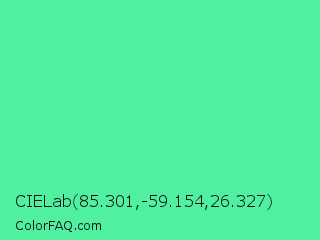 CIELab 85.301,-59.154,26.327 Color is a light green color and the nearest color is Eucalyptus #44d7a8. Hex code #50f0a1 and RGB value is rgb(80,240,161). In RGB color space, this color is composed of 31% red, 94% green, 63% blue, In CMYK color space, this color is composed of 67% cyan, 0% magenta, 33% yellow , 6% black , In HSL color space, this color has a hue angle of 150° , 84% saturation and 63% lightness.