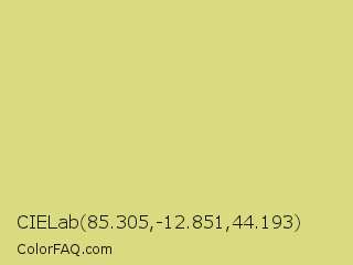 CIELab 85.305,-12.851,44.193 Color is a light yellow color and the nearest color is Medium Spring Bud #c9dc87. Hex code #dada80 and RGB value is rgb(218,218,128). In RGB color space, this color is composed of 85% red, 85% green, 50% blue, In CMYK color space, this color is composed of 0% cyan, 0% magenta, 41% yellow , 15% black , In HSL color space, this color has a hue angle of 60° , 55% saturation and 68% lightness.