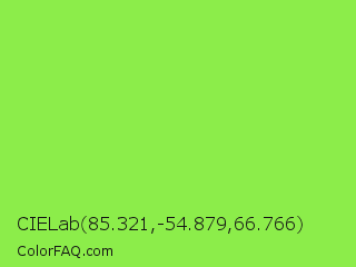 CIELab 85.321,-54.879,66.766 Color is a light green color and the nearest color is Kiwi #8ee53f. Hex code #8ced4a and RGB value is rgb(140,237,74). In RGB color space, this color is composed of 55% red, 93% green, 29% blue, In CMYK color space, this color is composed of 41% cyan, 0% magenta, 69% yellow , 7% black , In HSL color space, this color has a hue angle of 96° , 82% saturation and 61% lightness.