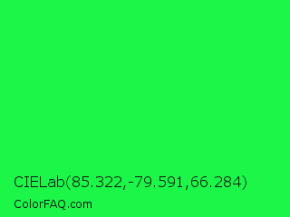 CIELab 85.322,-79.591,66.284 Color is a normal green color and the nearest color is Malachite #0bda51. Hex code #1cf649 and RGB value is rgb(28,246,73). In RGB color space, this color is composed of 11% red, 96% green, 29% blue, In CMYK color space, this color is composed of 89% cyan, 0% magenta, 70% yellow , 4% black , In HSL color space, this color has a hue angle of 132° , 92% saturation and 54% lightness.