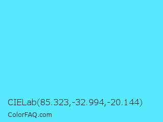 CIELab 85.323,-32.994,-20.144 Color is a light cyan color and the nearest color is Turquoise Blue #6cdae7. Hex code #57e8fa and RGB value is rgb(87,232,250). In RGB color space, this color is composed of 34% red, 91% green, 98% blue, In CMYK color space, this color is composed of 65% cyan, 7% magenta, 0% yellow , 2% black , In HSL color space, this color has a hue angle of 187° , 94% saturation and 66% lightness.