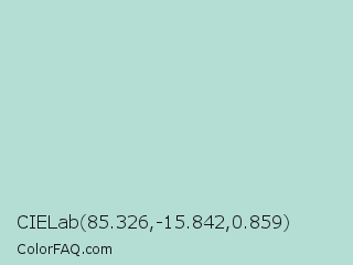 CIELab 85.326,-15.842,0.859 Color is a light cyan color and the nearest color is Jet Stream #b5d2ce. Hex code #b4ded3 and RGB value is rgb(180,222,211). In RGB color space, this color is composed of 71% red, 87% green, 83% blue, In CMYK color space, this color is composed of 19% cyan, 0% magenta, 5% yellow , 13% black , In HSL color space, this color has a hue angle of 164° , 39% saturation and 79% lightness.