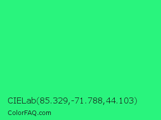 CIELab 85.329,-71.788,44.103 Color is a normal green color and the nearest color is Spring Green #00ff7f. Hex code #29f47d and RGB value is rgb(41,244,125). In RGB color space, this color is composed of 16% red, 96% green, 49% blue, In CMYK color space, this color is composed of 83% cyan, 0% magenta, 49% yellow , 4% black , In HSL color space, this color has a hue angle of 145° , 90% saturation and 56% lightness.
