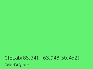 CIELab 85.341,-63.948,50.452 Color is a light green color and the nearest color is Screamin Green #66ff66. Hex code #62f170 and RGB value is rgb(98,241,112). In RGB color space, this color is composed of 38% red, 95% green, 44% blue, In CMYK color space, this color is composed of 59% cyan, 0% magenta, 54% yellow , 5% black , In HSL color space, this color has a hue angle of 126° , 84% saturation and 66% lightness.