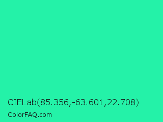 CIELab 85.356,-63.601,22.708 Color is a normal green color and the nearest color is Medium Spring Green #00fa9a. Hex code #24f2a8 and RGB value is rgb(36,242,168). In RGB color space, this color is composed of 14% red, 95% green, 66% blue, In CMYK color space, this color is composed of 85% cyan, 0% magenta, 31% yellow , 5% black , In HSL color space, this color has a hue angle of 158° , 89% saturation and 55% lightness.