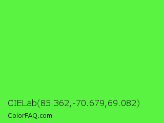 CIELab 85.362,-70.679,69.082 Color is a light green color and the nearest color is Screamin Green #66ff66. Hex code #5bf342 and RGB value is rgb(91,243,66). In RGB color space, this color is composed of 36% red, 95% green, 26% blue, In CMYK color space, this color is composed of 63% cyan, 0% magenta, 73% yellow , 5% black , In HSL color space, this color has a hue angle of 112° , 88% saturation and 61% lightness.