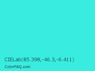 CIELab 85.398,-46.3,-6.411 Color is a normal cyan color and the nearest color is Turquoise #40e0d0. Hex code #38ede0 and RGB value is rgb(56,237,224). In RGB color space, this color is composed of 22% red, 93% green, 88% blue, In CMYK color space, this color is composed of 76% cyan, 0% magenta, 5% yellow , 7% black , In HSL color space, this color has a hue angle of 176° , 83% saturation and 57% lightness.