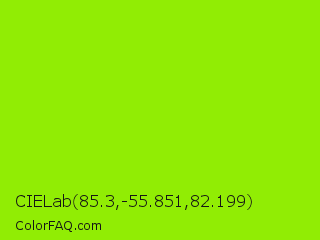 CIELab 85.3,-55.851,82.199 Color is a normal green color and the nearest color is Alien Armpit #84de02. Hex code #91ed04 and RGB value is rgb(145,237,4). In RGB color space, this color is composed of 57% red, 93% green, 2% blue, In CMYK color space, this color is composed of 39% cyan, 0% magenta, 98% yellow , 7% black , In HSL color space, this color has a hue angle of 84° , 97% saturation and 47% lightness.