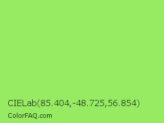 CIELab 85.404,-48.725,56.854 Color is a light green color and the nearest color is Inchworm #b2ec5d. Hex code #96eb63 and RGB value is rgb(150,235,99). In RGB color space, this color is composed of 59% red, 92% green, 39% blue, In CMYK color space, this color is composed of 36% cyan, 0% magenta, 58% yellow , 8% black , In HSL color space, this color has a hue angle of 98° , 77% saturation and 65% lightness.