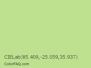 CIELab 85.409,-25.059,35.937 Color is a light green color and the nearest color is Medium Spring Bud #c9dc87. Hex code #bee190 and RGB value is rgb(190,225,144). In RGB color space, this color is composed of 75% red, 88% green, 56% blue, In CMYK color space, this color is composed of 16% cyan, 0% magenta, 36% yellow , 12% black , In HSL color space, this color has a hue angle of 86° , 57% saturation and 72% lightness.