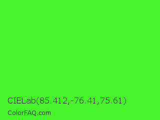 CIELab 85.412,-76.41,75.61 Color is a normal green color and the nearest color is Neon Green #39ff14. Hex code #47f52b and RGB value is rgb(71,245,43). In RGB color space, this color is composed of 28% red, 96% green, 17% blue, In CMYK color space, this color is composed of 71% cyan, 0% magenta, 82% yellow , 4% black , In HSL color space, this color has a hue angle of 112° , 91% saturation and 56% lightness.