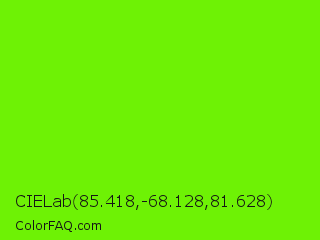 CIELab 85.418,-68.128,81.628 Color is a normal green color and the nearest color is Bright Green #66ff00. Hex code #6ef205 and RGB value is rgb(110,242,5). In RGB color space, this color is composed of 43% red, 95% green, 2% blue, In CMYK color space, this color is composed of 55% cyan, 0% magenta, 98% yellow , 5% black , In HSL color space, this color has a hue angle of 93° , 96% saturation and 48% lightness.