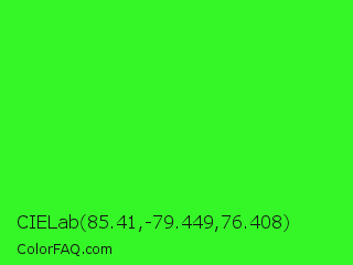CIELab 85.41,-79.449,76.408 Color is a normal green color and the nearest color is Neon Green #39ff14. Hex code #35f627 and RGB value is rgb(53,246,39). In RGB color space, this color is composed of 21% red, 96% green, 15% blue, In CMYK color space, this color is composed of 78% cyan, 0% magenta, 84% yellow , 4% black , In HSL color space, this color has a hue angle of 116° , 92% saturation and 56% lightness.