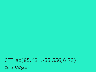 CIELab 85.431,-55.556,6.73 Color is a normal cyan color and the nearest color is Turquoise PWG #30d5c8. Hex code #26f0c7 and RGB value is rgb(38,240,199). In RGB color space, this color is composed of 15% red, 94% green, 78% blue, In CMYK color space, this color is composed of 84% cyan, 0% magenta, 17% yellow , 6% black , In HSL color space, this color has a hue angle of 168° , 87% saturation and 55% lightness.